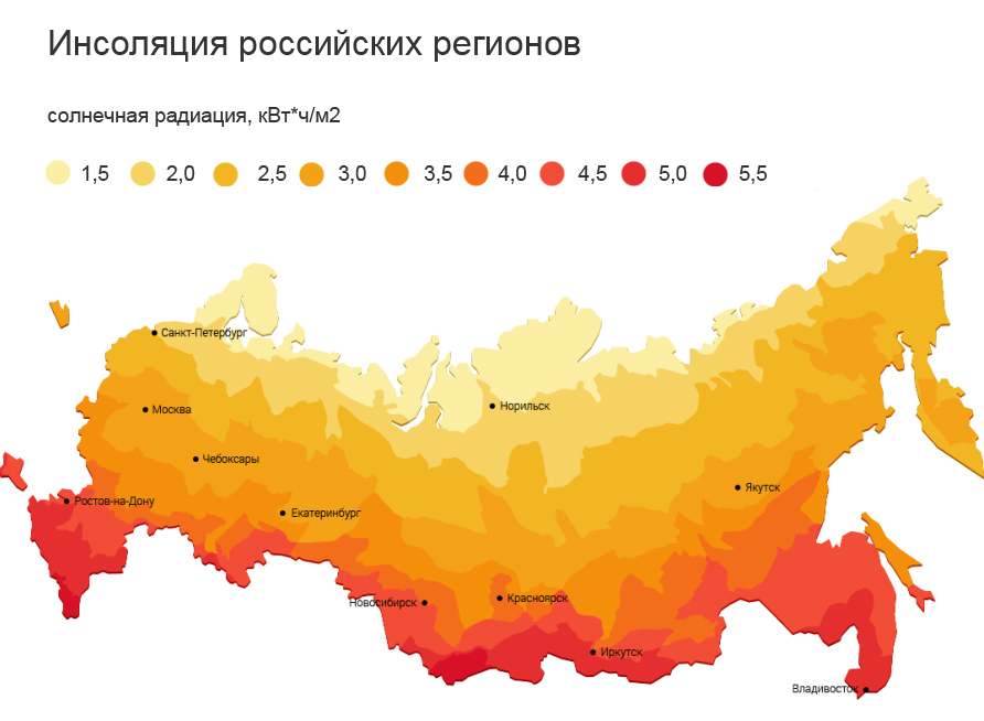 Сколько солнца в России? Россия обладает достаточно высоким уровнем инсоляции - у нас есть довольно много районов, где среднегодовой приход солнечной радиации составляет 4-5 кВт*ч на квадратный метр в день (этот показатель соизмерим с югом Германии и севером Испании - странах-лидерах по внедрению солнечных систем). При этом высокий уровень инсоляции в России не только на юге - Краснодарском крае, Ростовской области, Кавказе, но также на Алтае, да и в целом на юге Сибири, Дальнем Востоке и в Забайкалье - в этих регионах количество солнечных дней в году доходит до 300.