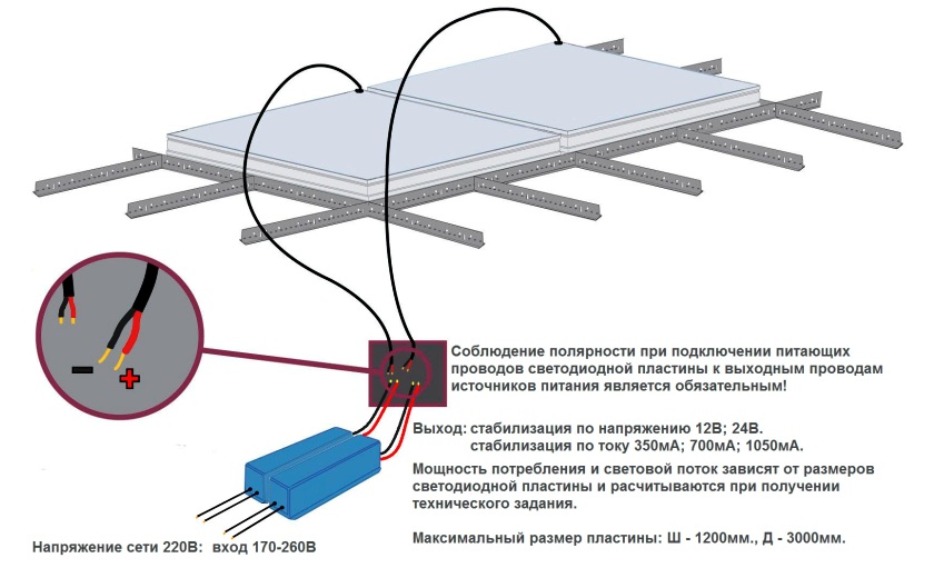 Светорассеивающая светодиодная пластина с изображением устанавливается в посадочное место декоративного короба-откоса. Каждая светодиодная пластина, после установки, подключается к сети 220В через блок питания светодиодов (см.рисунок выше).