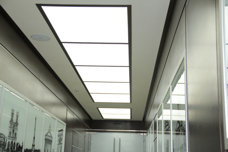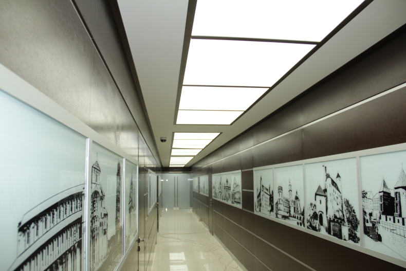 Использовались светодиодные панели размером: потолочные в зоне ресепшн 970х2900 мм. потолочные в корридорах 800х1000мм.
